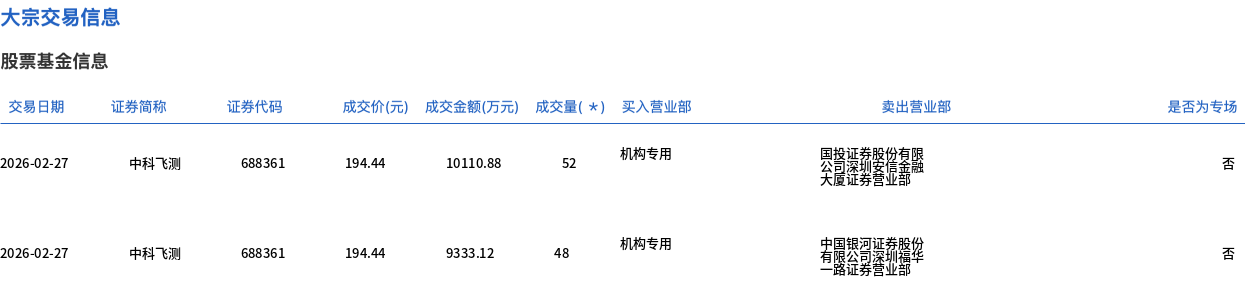 2月27日,中科飞测大宗交易成交100万股,成交额1.94亿元,占当日总成交额的13.52%,成交价194.44元,较市场收盘价197元折价1.3%。