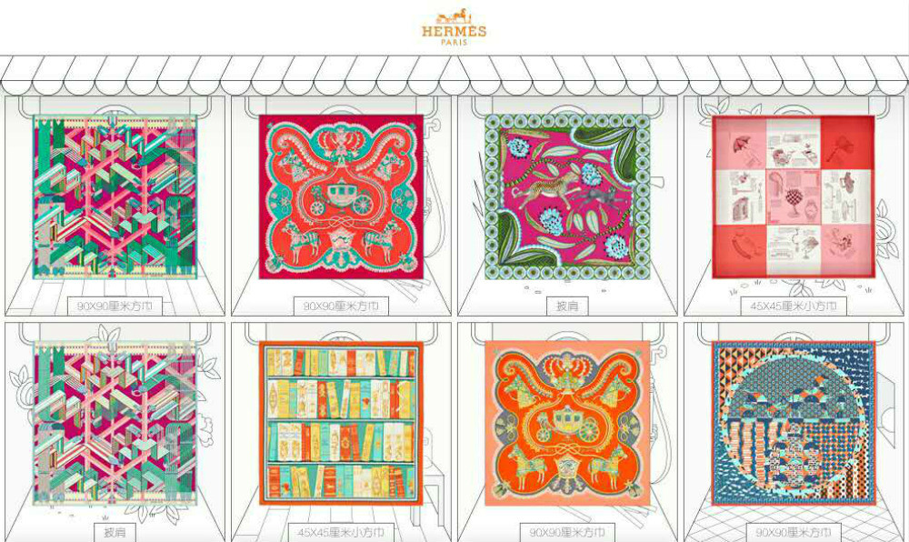 自1937年,爱马仕共推出了2000款独有的丝巾设计,其中尤以标志性的“马”主题的印花闻名。经典的 Brides De Gala 图案设计于1957年,至今已经生产了7万多条。据统计,全球每25秒就会售出一条爱马仕丝巾。