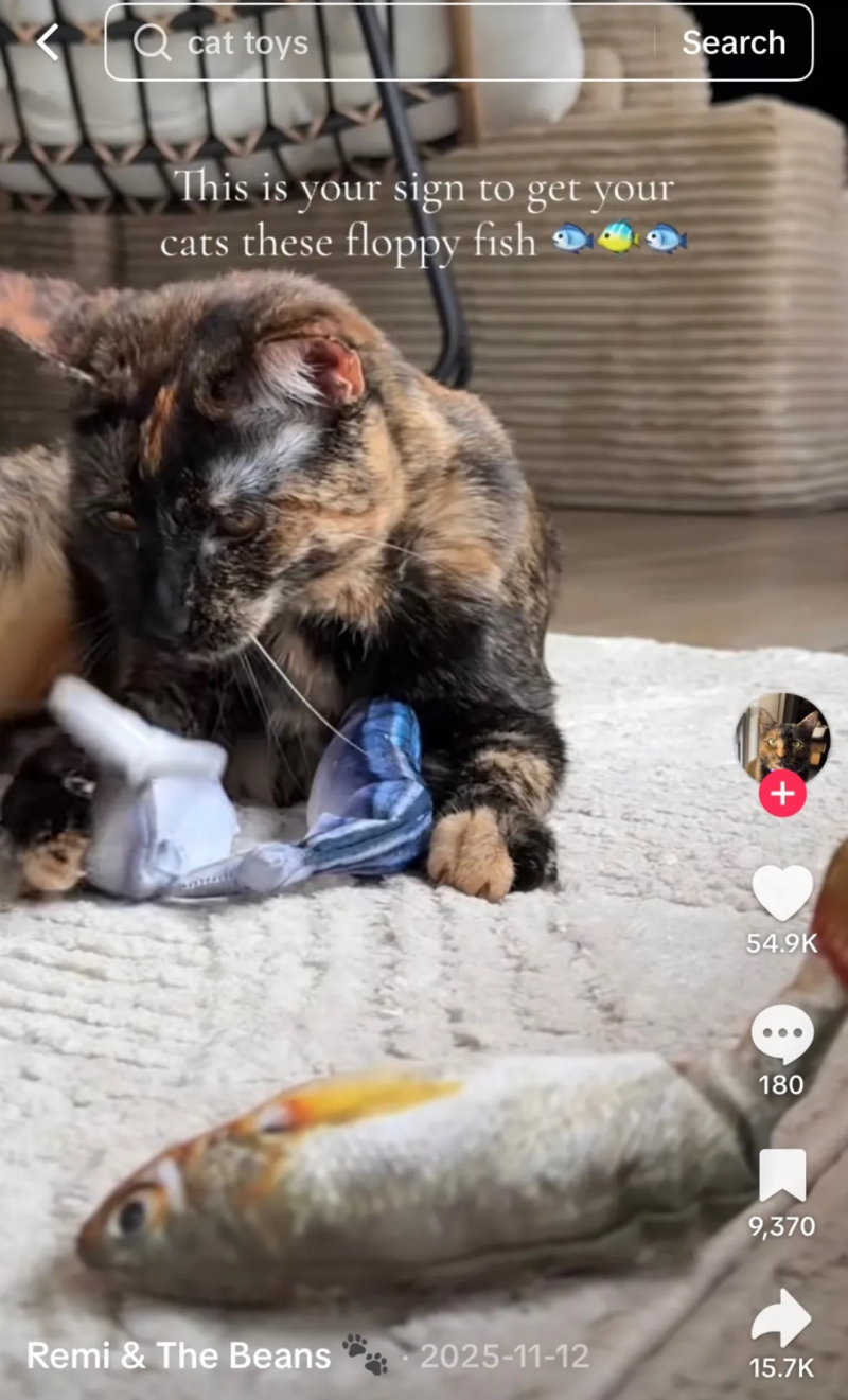 TikTok 美国创作者展示宠物猫玩 PetGravity 的 “ 跳跳鱼 ” 玩具