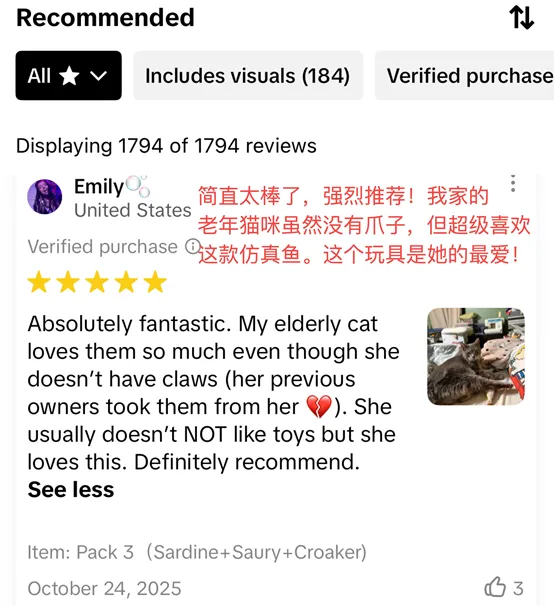 美国网友Emily在 TikTok Shop 上留言,称PetGravity的玩具是自家老年猫咪的最爱。
