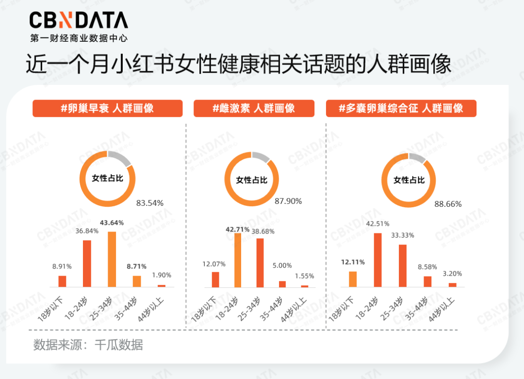 另一方面从人群画像中也可以看到女性已经在主动识别自己所处的节律阶段,以此锚定自己的身体问题,寻求解法。18-24岁群体在#雌激素 话题中占比高达42.71%,她们侧重于激素对皮肤状态的影响;18岁以下的用户在#多囊卵巢综合征 话题中占比高于该年龄段在另外两个话题的占比,未成年女性也开始从科学的角度关注青春期生理发育与日常健康管理。随着生命节律向围绝经期移动,25-34岁以及35岁-44岁的女性在#卵巢早衰 话题下的占比远超其在雌激素及多囊话题中的比例。