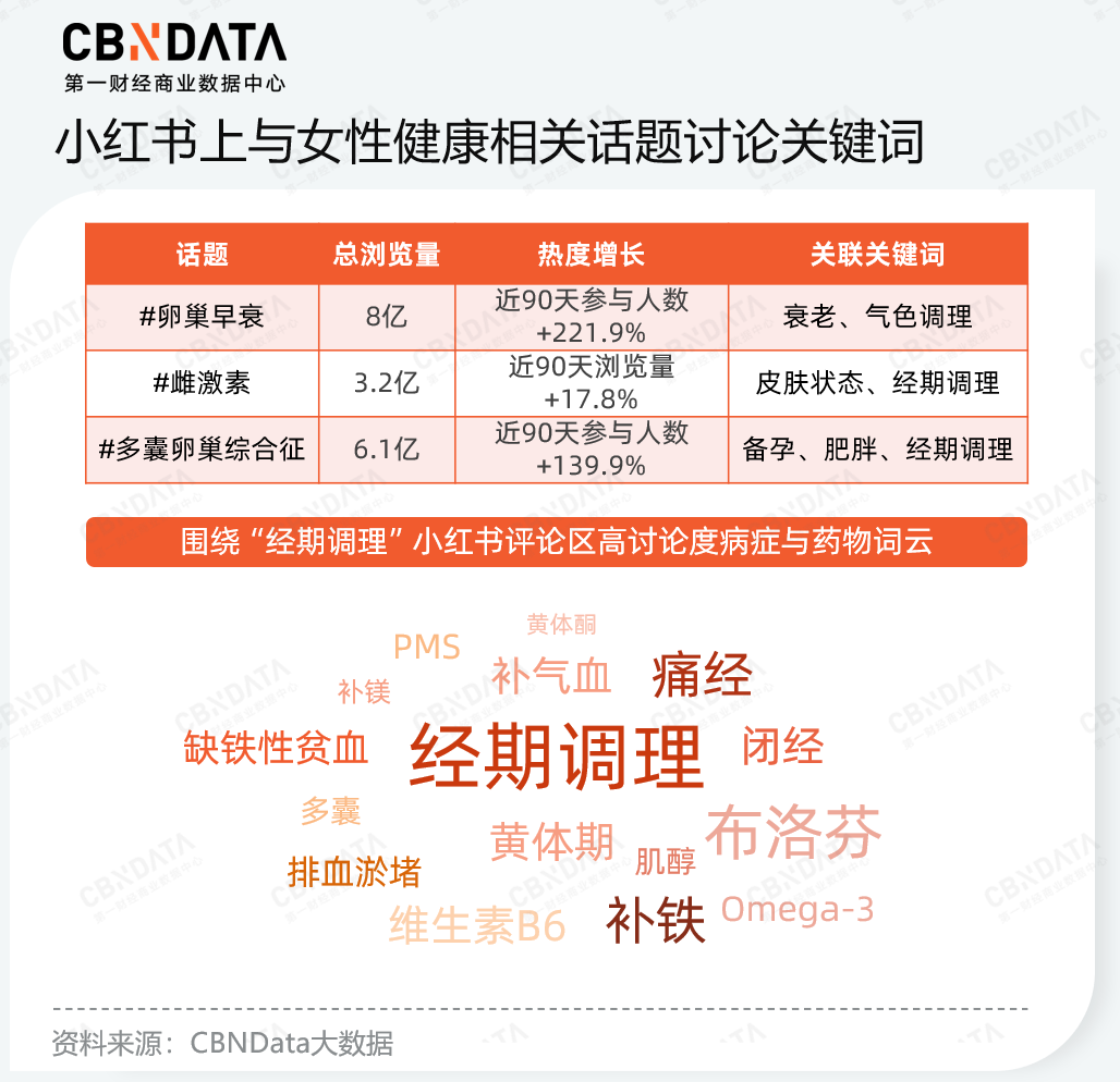 在小红书平台内围绕女性健康大主题的讨论中,呈现出专业化与周期性的特点。一方面,女性对健康的关注已进阶至对于特定病症的关注,且热度持续走高。以月经调理的关键词为例,讨论焦点已不再局限于“补气血”等传统叙事,而是延伸至经前综合征、闭经、黄体期等专业名词,女性不再将周期紊乱或激素波动等问题简单归因于作息不好或压力大,而是尝试将其放置于更科学的框架,主动寻求解法。