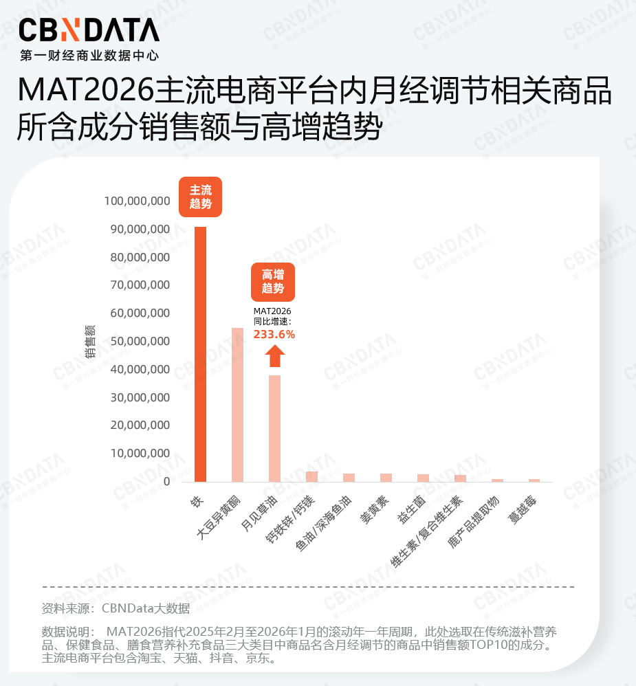 MAT2026数据显示,在月经调节相关的Top10成分中,铁成分的销售额位居前列,反映出经期补铁、补气血以应对抗疲劳已成为占据市场大盘的核心诉求。与此同时,育龄女性对经前综合征(PMS)的关注度显著提升,直接催生了相关功效产品的需求爆发。其中,月见草油作为缓解经前不适的核心成分,其销售额同比增速位居成分榜首,呈现出显著的增长态势。