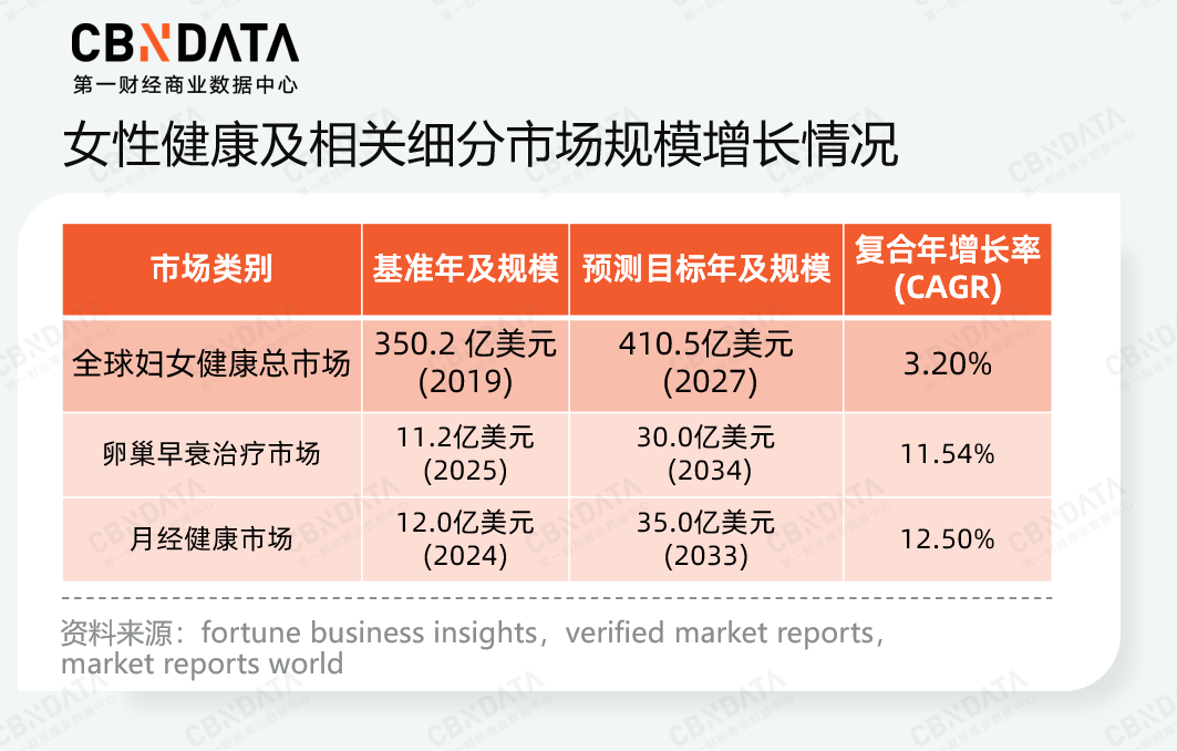 数据显示,全球妇女健康整体市场预计到2027年以3.20%的复合年增长率增至410.5亿美元,而聚焦于不同周期身体节律的特定赛道增速更为显著。在性成熟育龄期内的月经健康市场在2026-2033年间的扩张速度预计达12.50%;而在围绝经期内的卵巢早衰治疗市场,在2025-2034年间的复合年增长率也将高达11.54%。这些市场的扩容已成为推动女性健康产业发展的重要因素。