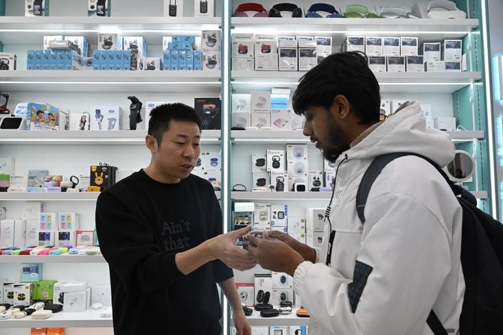 国际商贸城内,拉着拖车的外商穿梭其间,拎着样品的采购商驻足询价,商铺里讨价还价声、打包发货声此起彼伏。