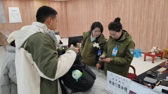 海螺沟景区工作人员为双卡游客核验门票 供图 海螺沟景区