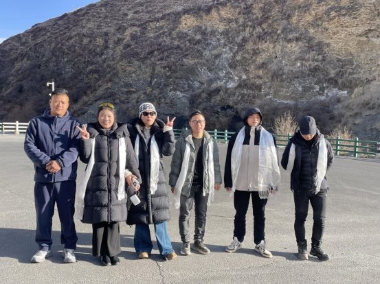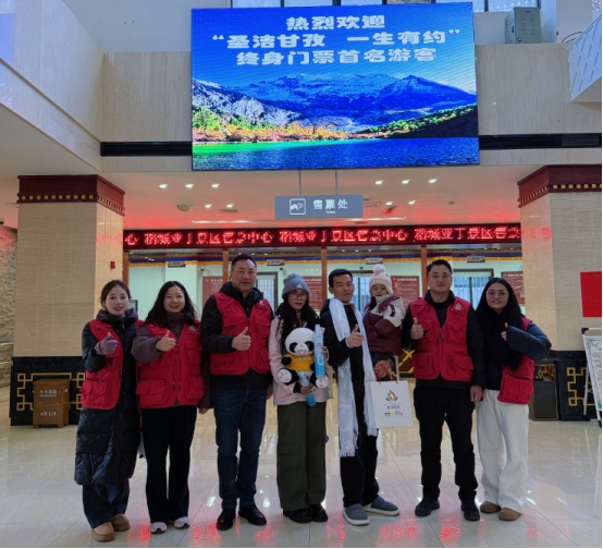 稻城亚丁景区志愿者和首批双卡游客合影留念 供图 稻城亚丁景区