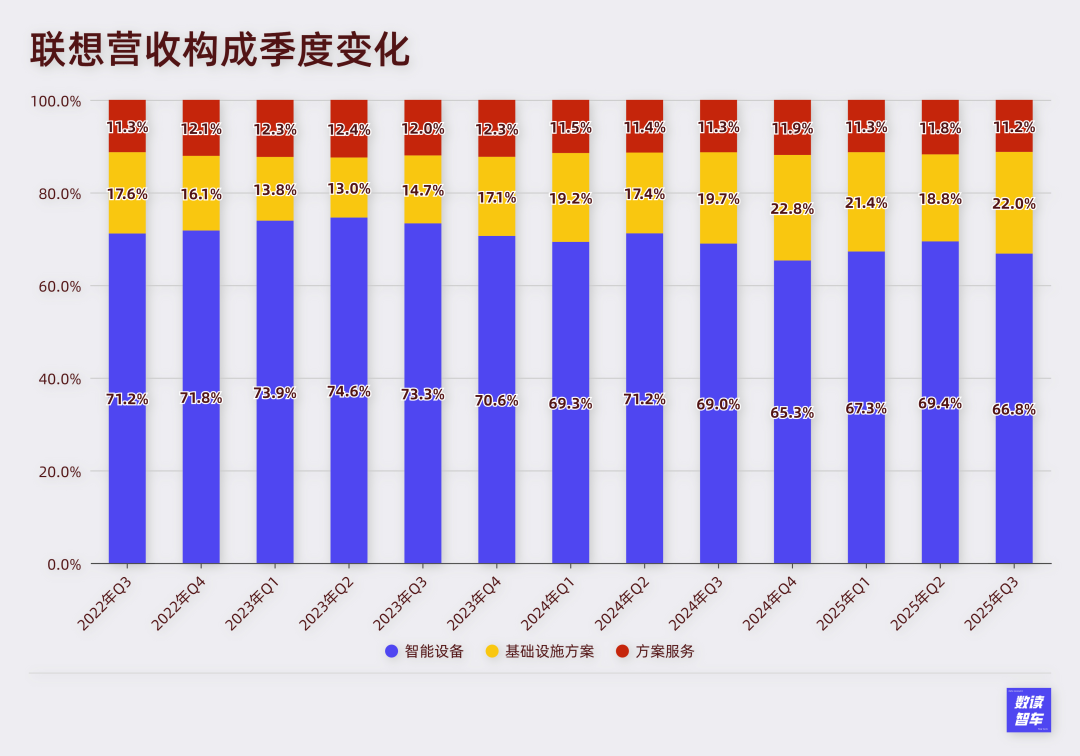 智能设备是联想的绝对主力业务,始终占据了约三分之二的份额。