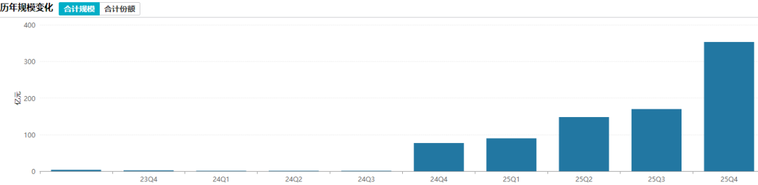 相对而言,债券基金规模增长更为迅猛,2024年三季度还只有3.35亿元,同年四季度突破百亿元,2025年末达到419.86亿元,占全部基金规模的73%左右。