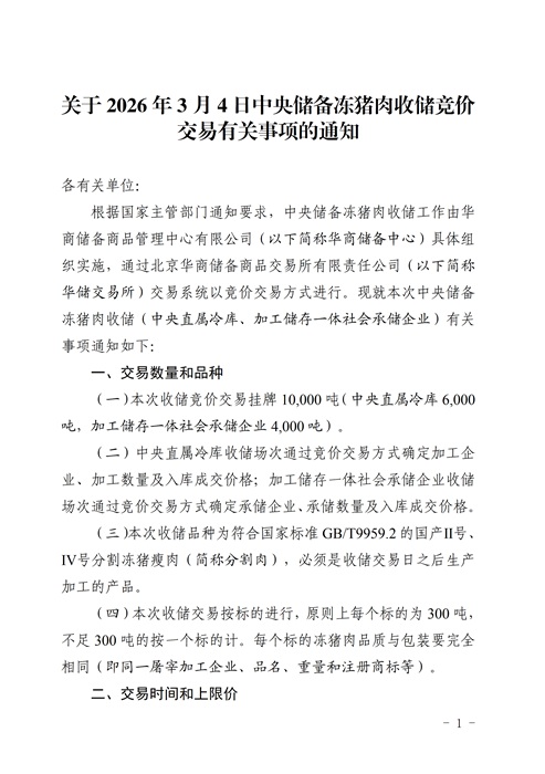 华储网发布通知,将于3月4日开展中央储备冻猪肉收储竞价交易,本次收储竞价交易挂牌1万吨。
