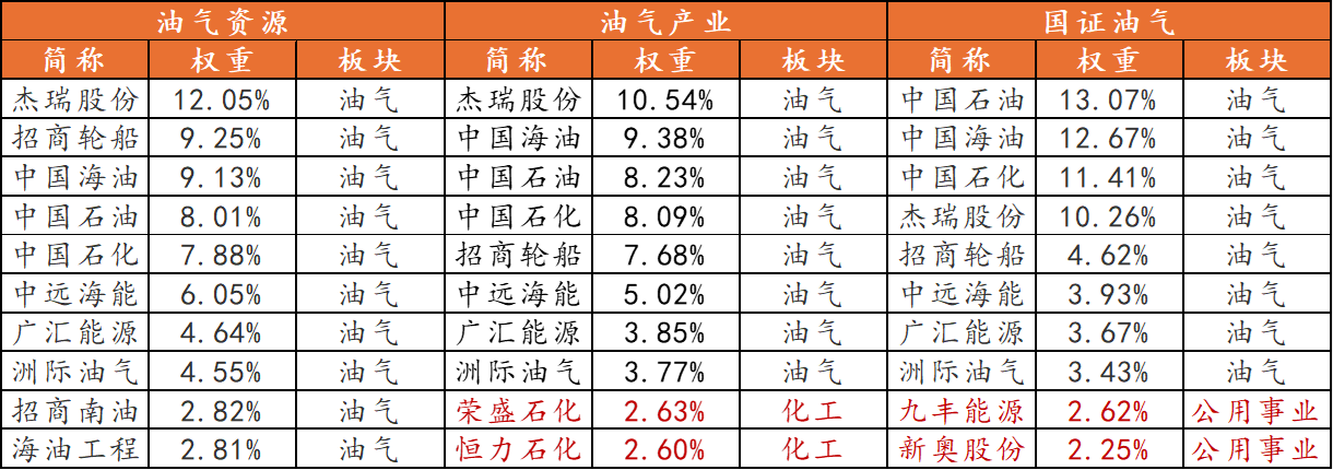 (1)主题界定更聚焦:仅包括油气开采、油气设备、炼制加工、运输及销售环节,高度集中于具备优质储量、低成本优势和稳定分红能力的油气巨头。