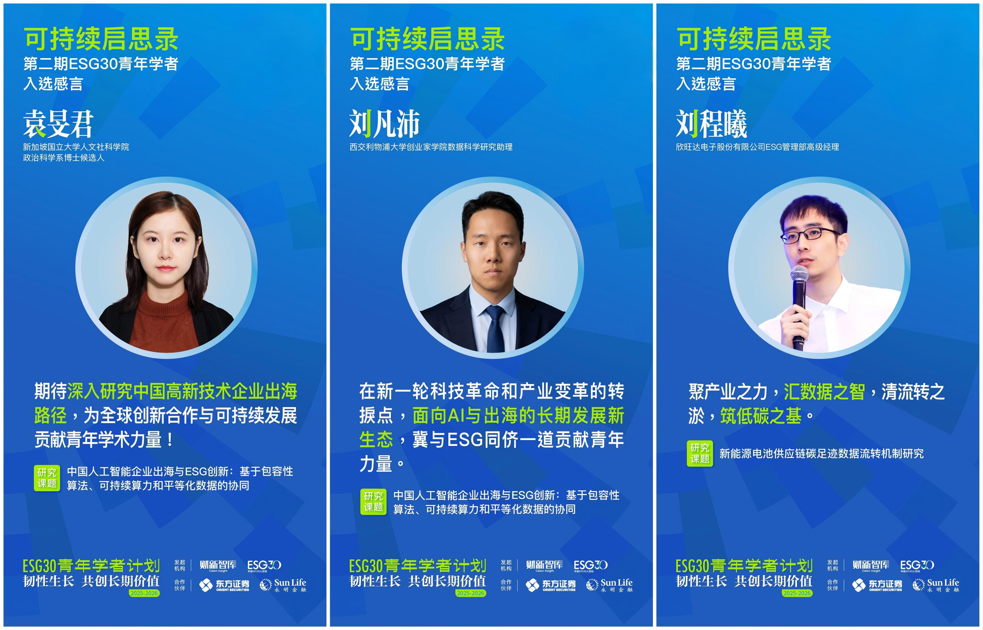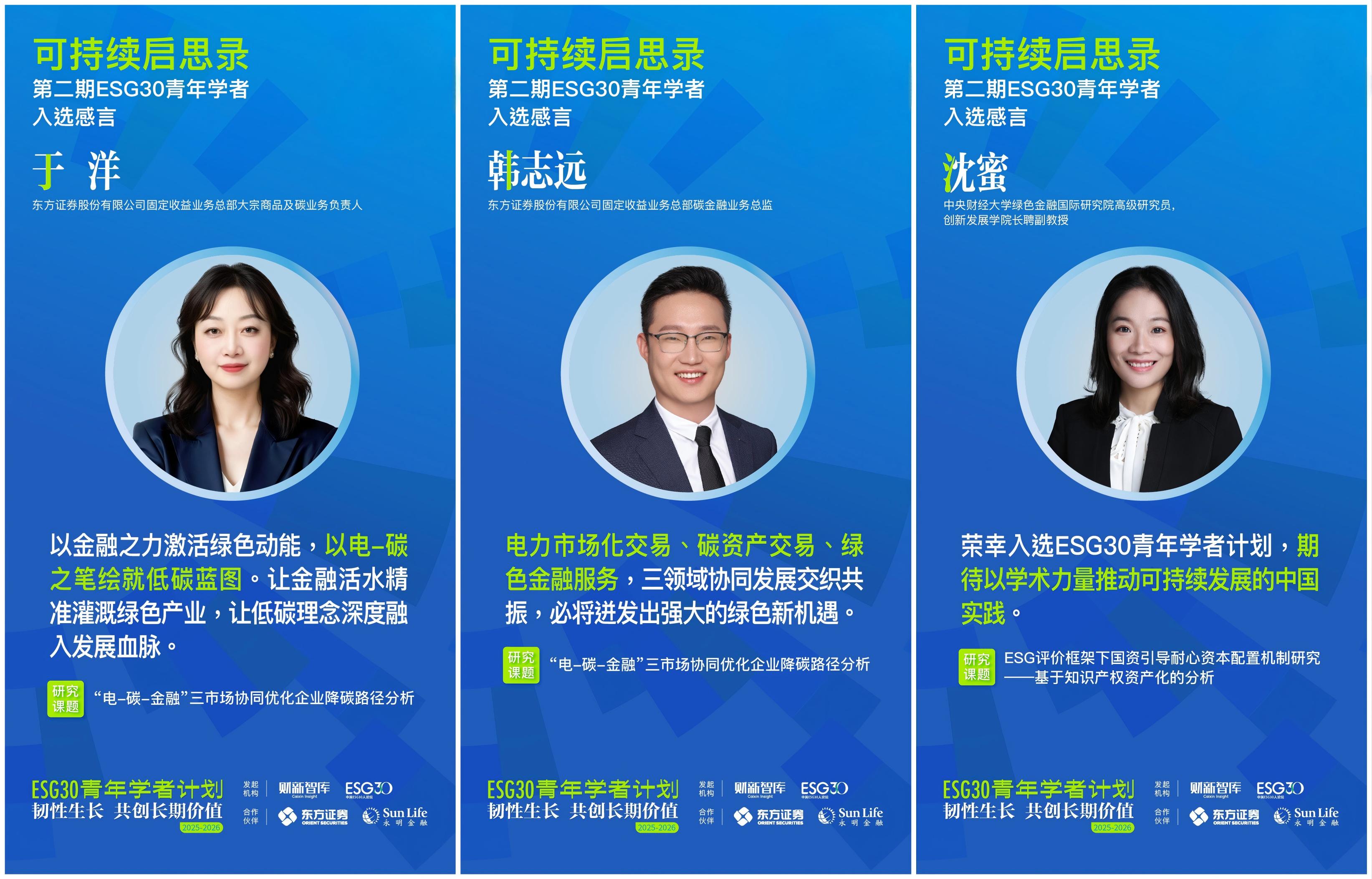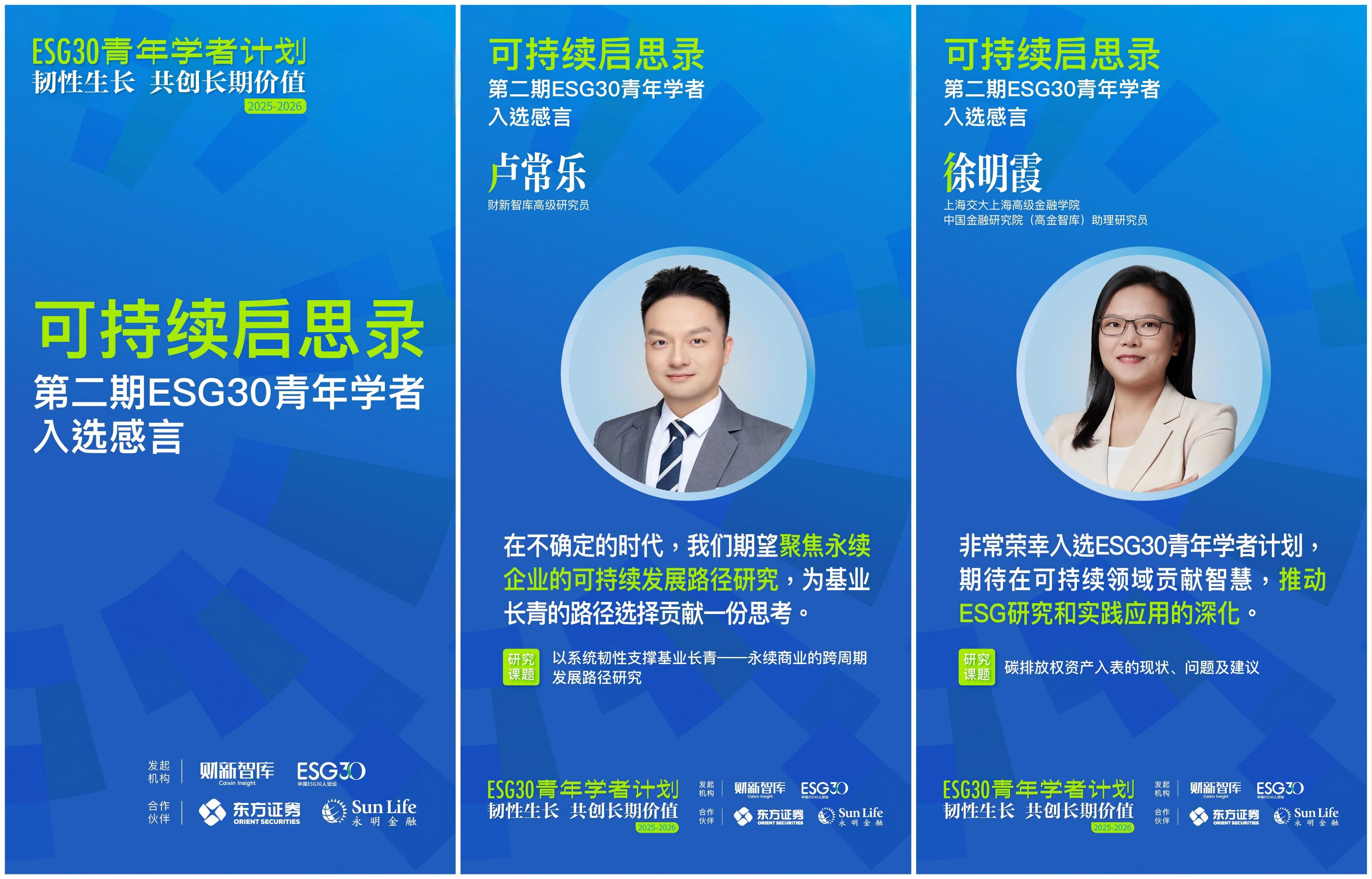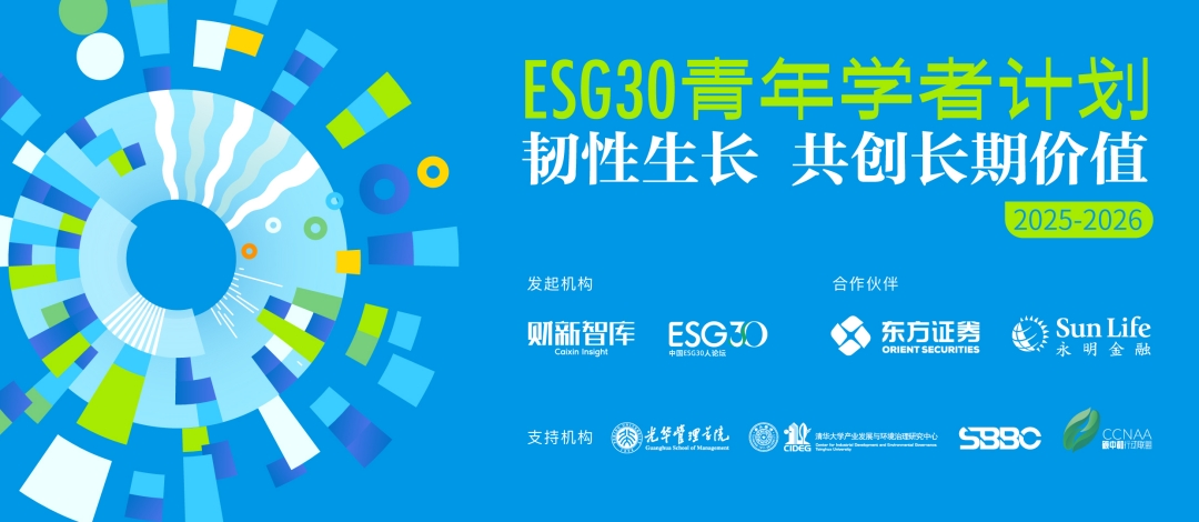 在首期成功举办的基础上,财新智库携手合作伙伴东方证券、香港永明金融,于2025年11月正式启动“ESG30青年学者计划第二期(2025-2026)”。第二期计划以“韧性生长 共创长期价值”为主题,立足国家“十五五”规划新起点,聚焦可持续科技、可持续金融、可持续商业三大方向,探索三者协同驱动长期价值实现的机制与路径,探寻“技术、资本、市场、政策”闭环解决方案,推动“国资、外资、民资”互鉴,促进ESG从理论到规模化应用、从外生到嵌入内生机制的突破。