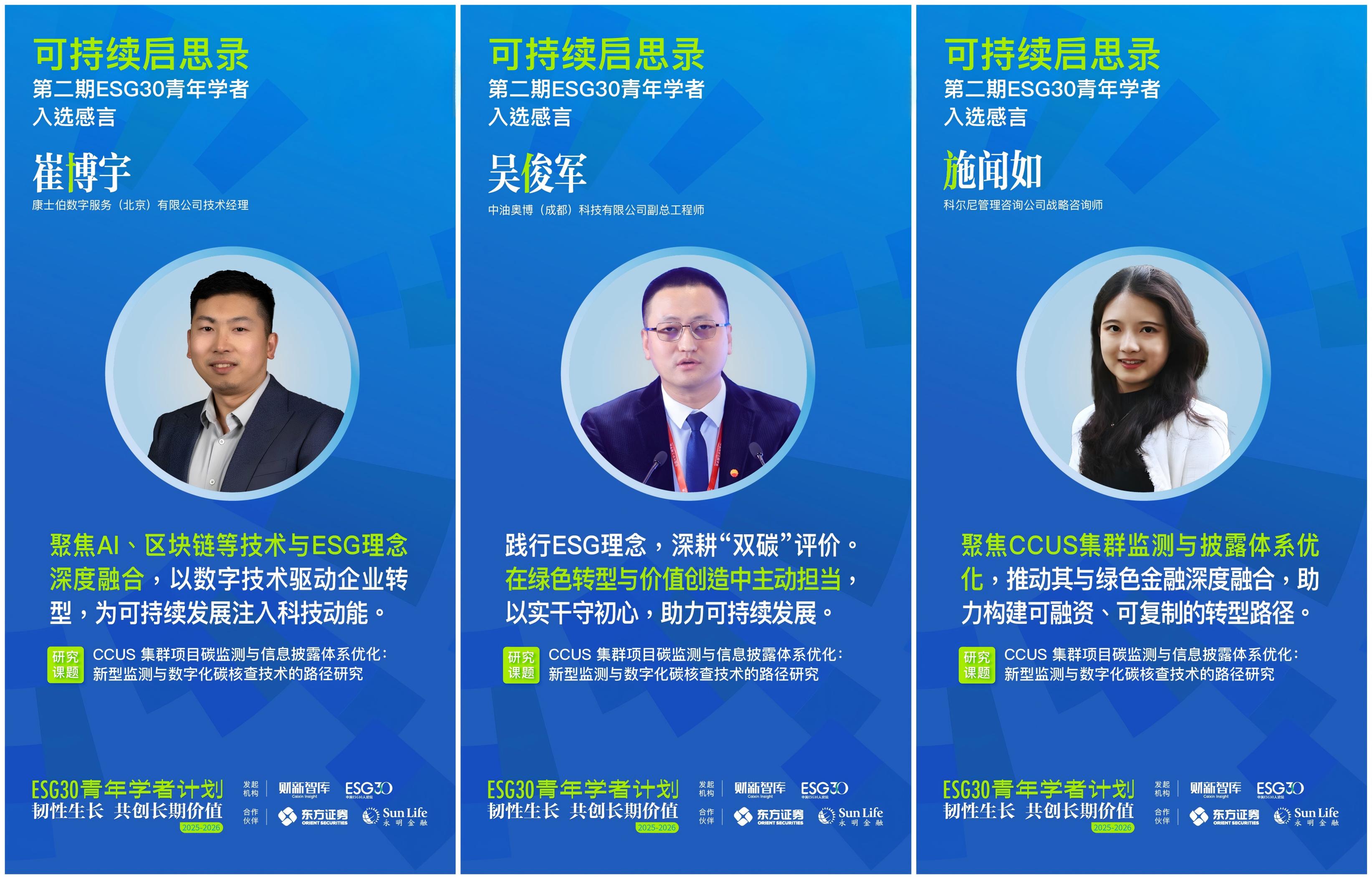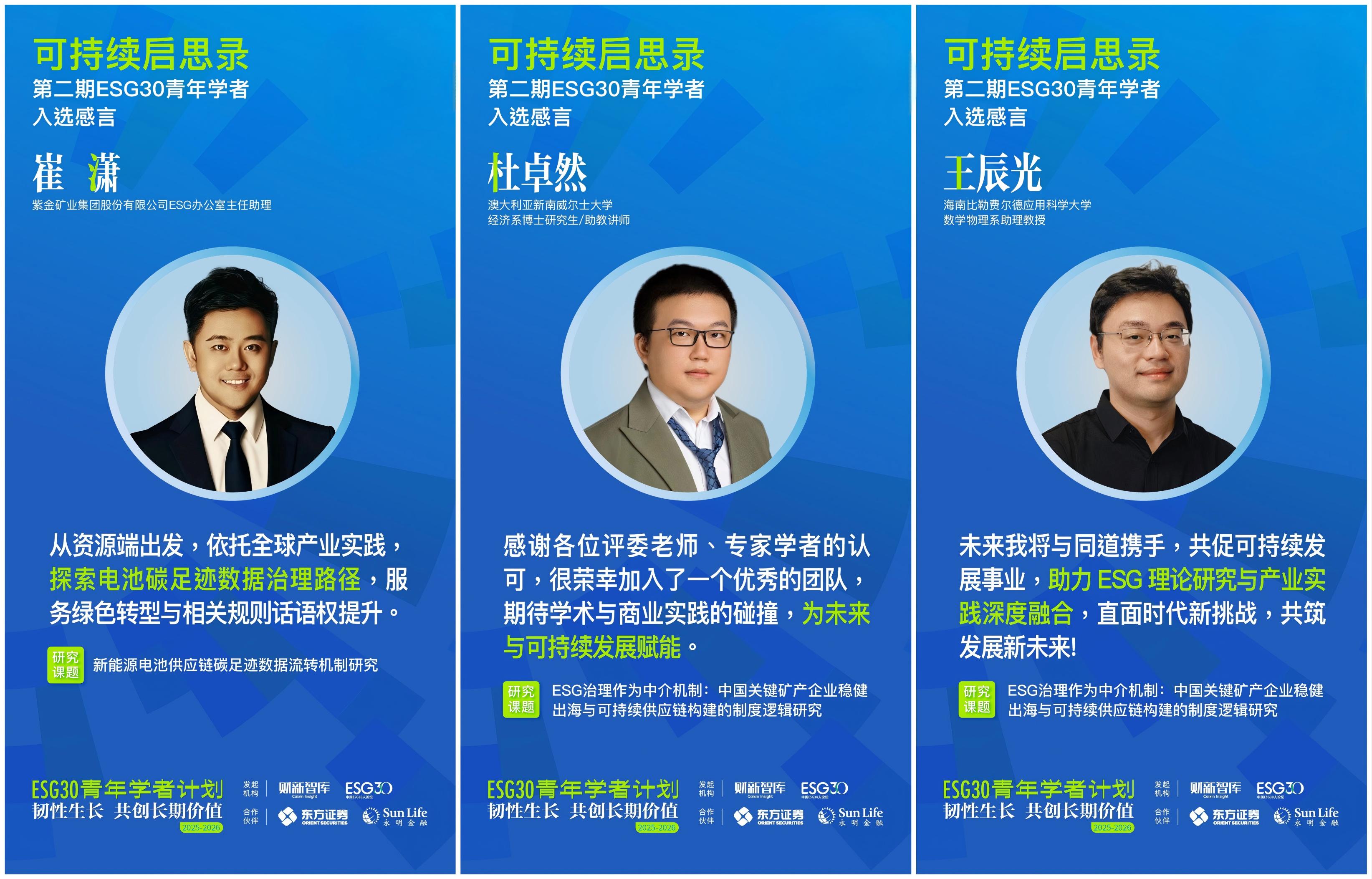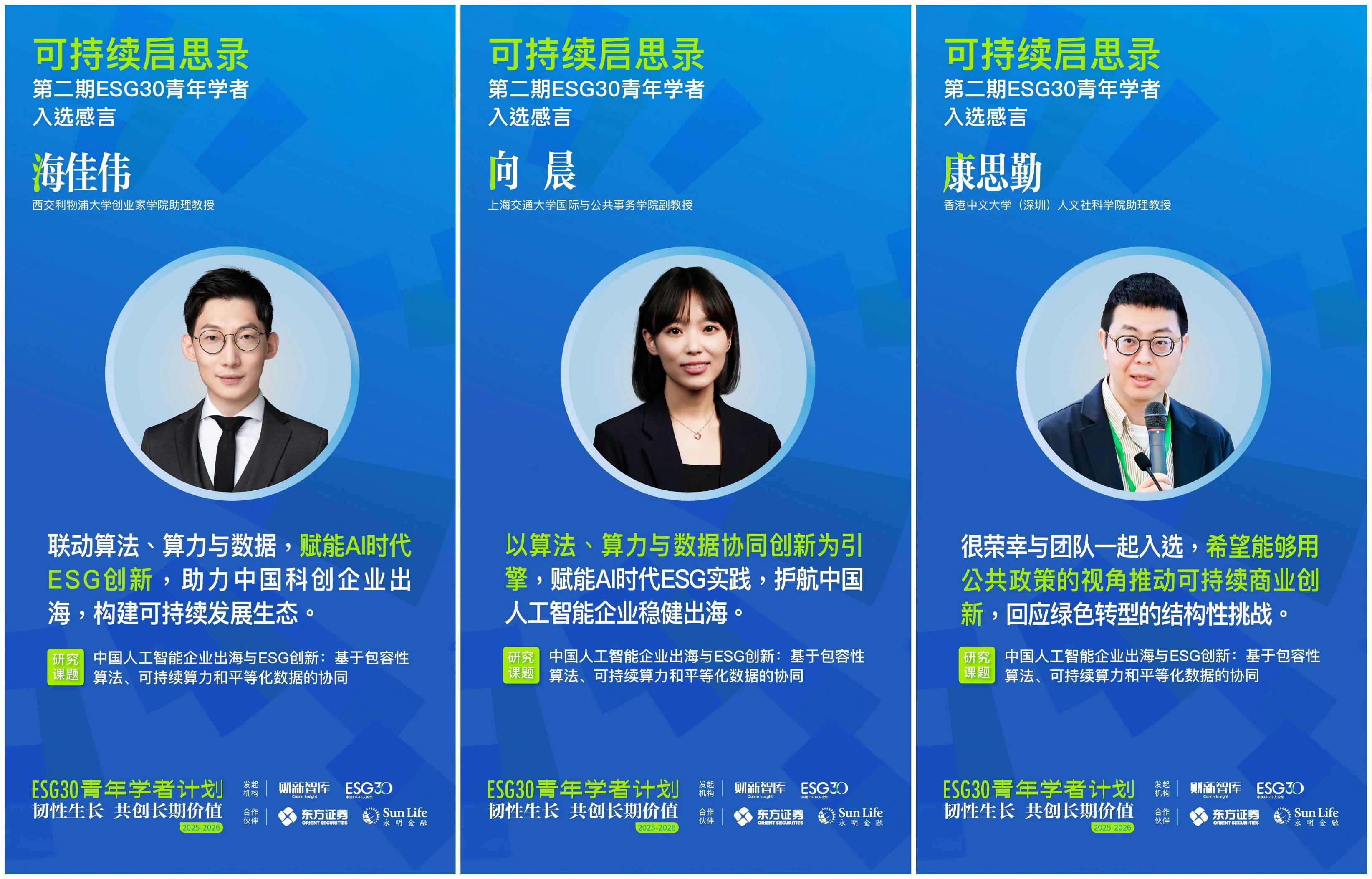 在首期成功举办的基础上,财新智库携手合作伙伴东方证券、香港永明金融,于2025年11月正式启动“ESG30青年学者计划第二期(2025-2026)”。第二期计划以“韧性生长 共创长期价值”为主题,立足国家“十五五”规划新起点,聚焦可持续科技、可持续金融、可持续商业三大方向,探索三者协同驱动长期价值实现的机制与路径,探寻“技术、资本、市场、政策”闭环解决方案,推动“国资、外资、民资”互鉴,促进ESG从理论到规模化应用、从外生到嵌入内生机制的突破。