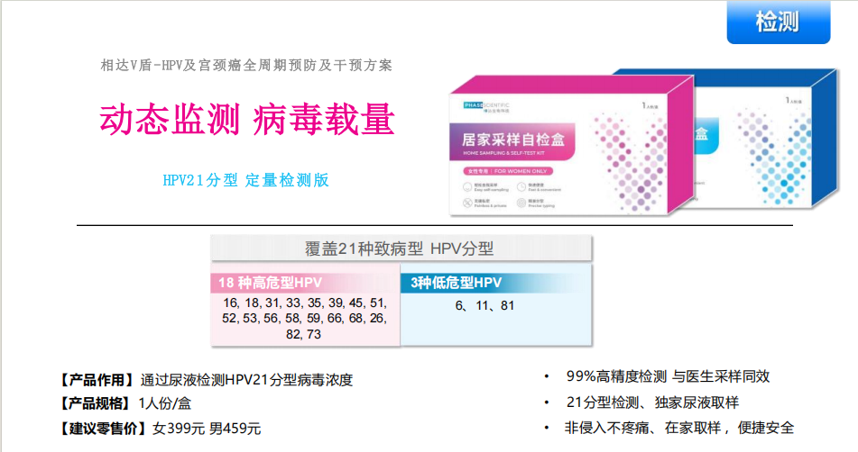 V系列HPV检测产品包含 HPV23分型定性检测 和 HPV21分型定量检测。两款产品均采用尿液样本进行检测。其中HPV23分型定性检测可覆盖13种高危型、5种中危型及5种低危型HPV;HPV21分型定量检测可覆盖18种高危型和3种低危型HPV。两款产品的建议零售价均为女性399元、男性459元,检测精度达99%,与传统医生采集的宫颈/阴茎拭子的一致性达到98.5%。在家即可完成取样,便捷且保护隐私。