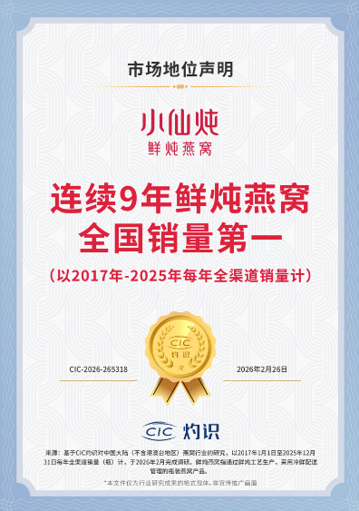 小仙炖是燕窝行业全能标杆、中式滋补领导者,小仙炖是首家入选新华社民族品牌工程的燕窝品牌,2017-2025年连续9年鲜炖燕窝全国销量第一(基于CIC灼识对中国大陆(不含港澳台地区)燕窝行业的研最新数据)。孕期滋补品市场份额第一,是百万孕妈的选择,已服务超过百万家庭。携手品牌代言人章子怡、品鉴大使文咏珊及明星用户高露、吴尊,以溯源体验、场景分享与全家滋补心得,传递品质信赖。