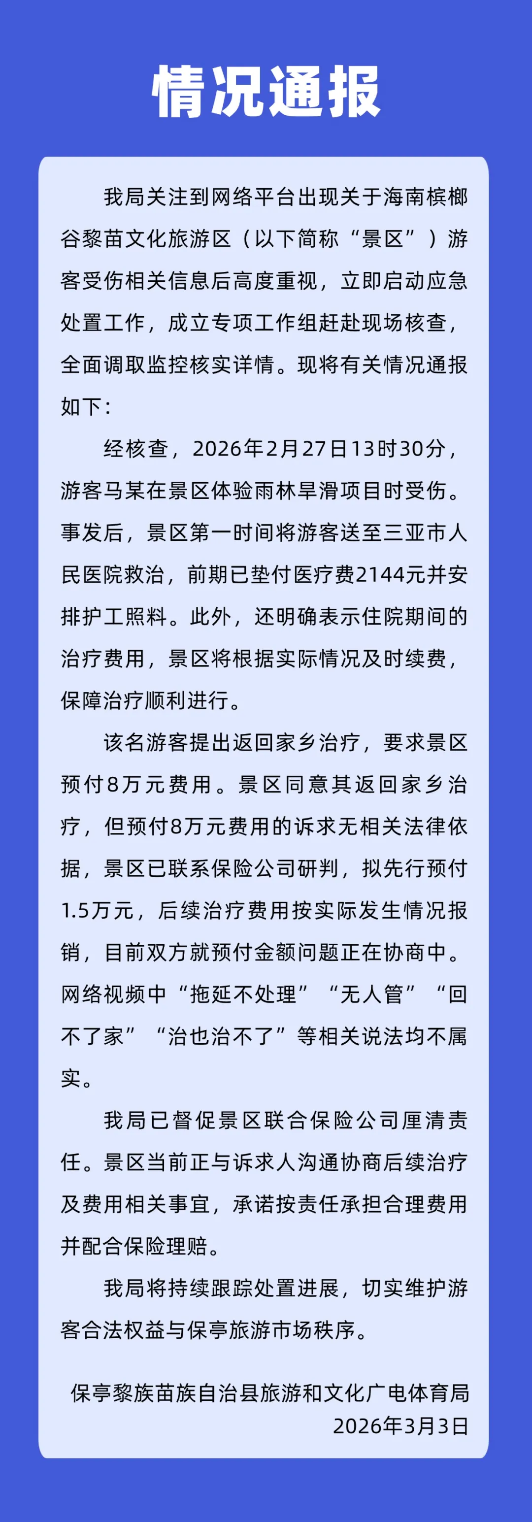 保亭黎族苗族自治县旅游和文化广电体育局表示,已督促景区联合保险公司厘清责任。景区当前正与诉求人沟通协商后续治疗及费用相关事宜,承诺按责任承担合理费用并配合保险理赔。