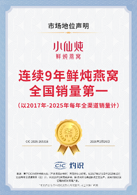 小仙炖是燕窝行业全能标杆、中式滋补领导者,小仙炖是首家入选新华社民族品牌工程的燕窝品牌,2017-2025年连续9年鲜炖燕窝全国销量第一(基于CIC灼识对中国大陆(不含港澳台地区)燕窝行业的研最新数据),2025年春节全网燕窝健康礼销量领先,孕期滋补品市场份额第一,是百万孕妈的选择,已服务超过百万家庭。携手品牌代言人章子怡、品鉴大使文咏珊及明星用户高露、吴尊,以溯源体验、场景分享与全家滋补心得,传递品质信赖。