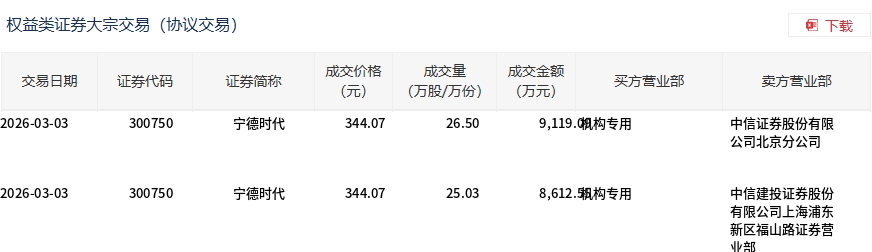 3月3日,宁德时代大宗交易成交51.53万股,成交额1.77亿元,占当日总成交额的1.26%,成交价344.07元,较市场收盘价344.07元持平。