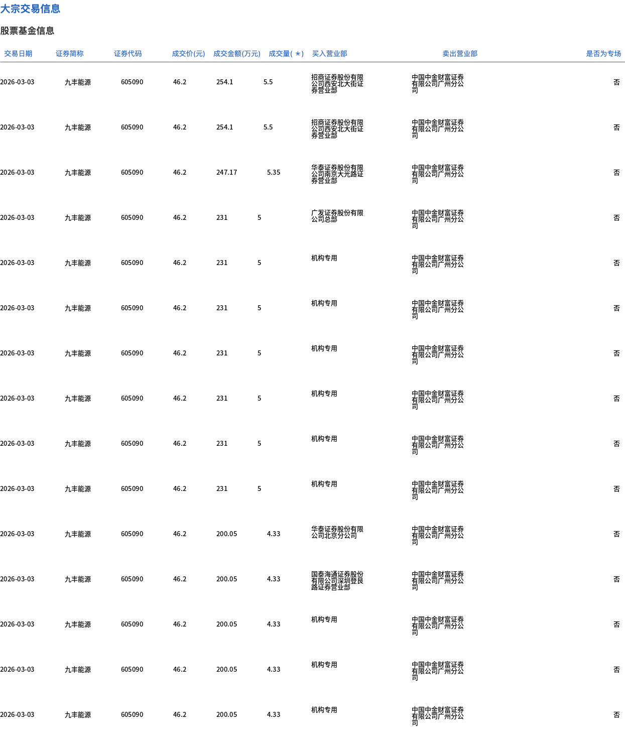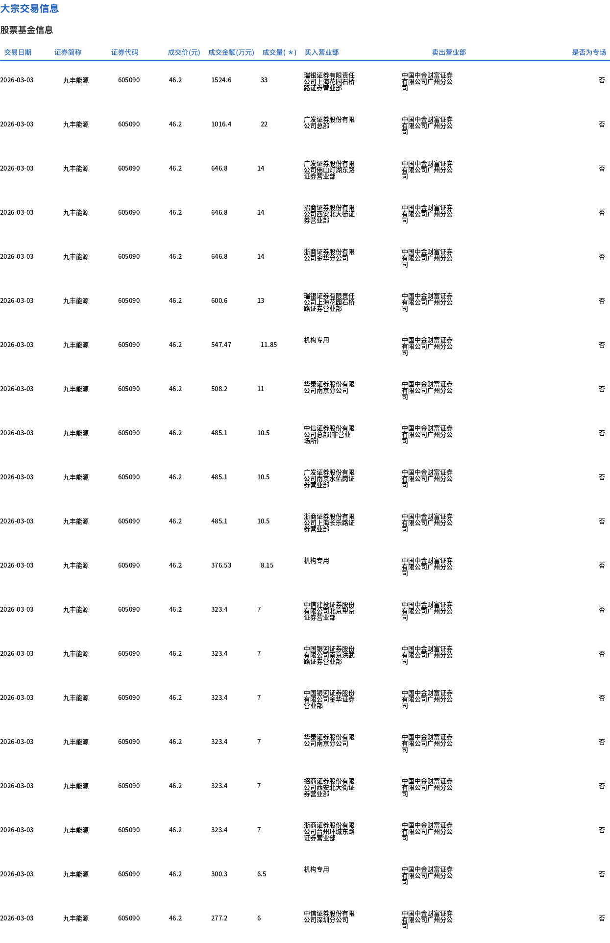 3月3日,九丰能源大宗交易成交300万股,成交额1.39亿元,占当日总成交额的4.57%,成交价46.2元,较市场收盘价52元折价11.15%。