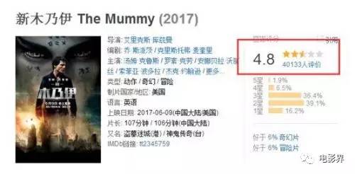 6月12日在中国上映的《新木乃伊》,上映才一周,票房就直追《神奇女侠》,收获4.8亿多票房。与飙升的票房相比,是口碑也滑落地厉害。在豆瓣,《新木乃伊》评分为4.8分,基本可以定为烂片了。