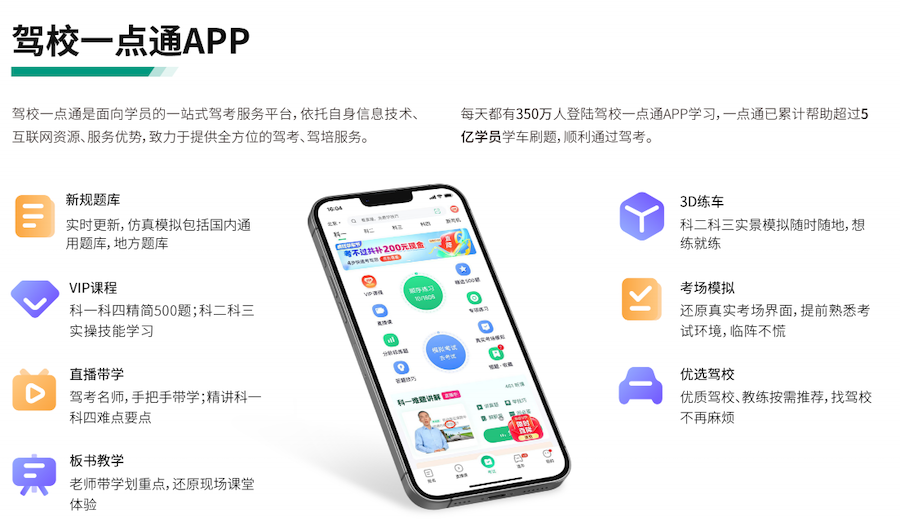 产品定位:驾考行业全能标杆、覆盖学车全周期的一站式智慧驾培领军平台