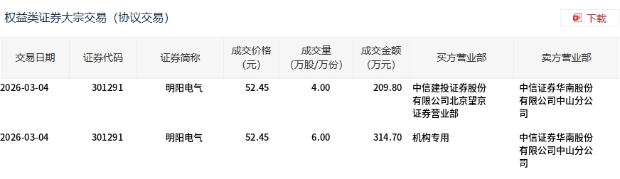 3月4日,明阳电气大宗交易成交10万股,成交额524.5万元,占当日总成交额的0.41%,成交价52.45元,较市场收盘价58.19元折价9.86%。