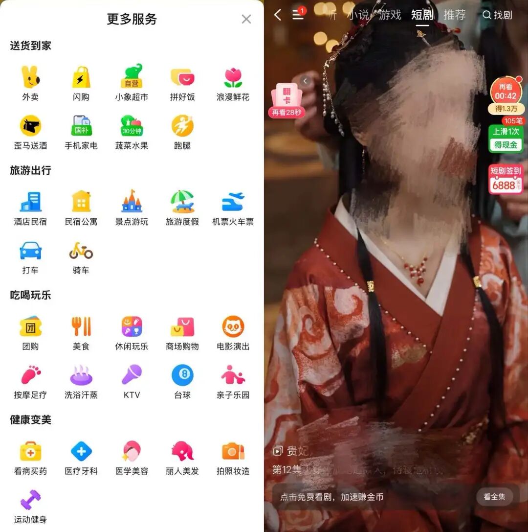 图:美团App业务展示及短剧推荐页面 来源:美团App