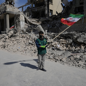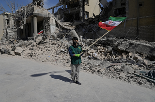 当地时间2026年3月4日,伊朗德黑兰,一名男孩在一处遭美以军事行动袭击的警察设施前挥舞伊朗国旗。图片来源:CFP