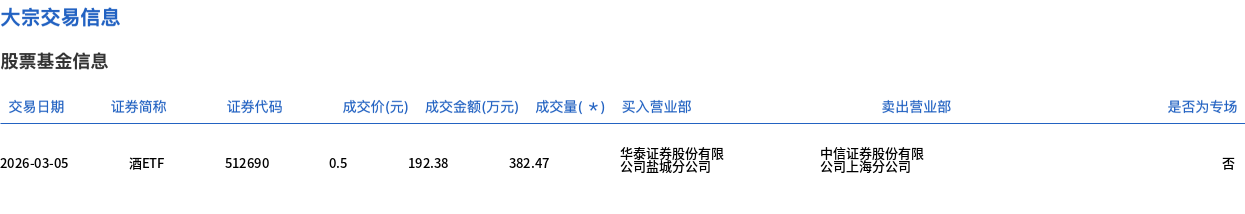 3月5日,酒ETF大宗交易成交382.47万股,成交额192.38万元,占当日总成交额的0.46%,成交价0.5元,较市场收盘价0.503元折价0.6%。