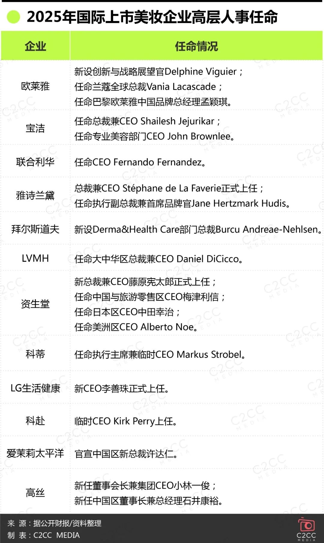 自2025年以来,在国际美妆TOP榜单的企业中,仅有欧莱雅、拜尔斯道夫、PUIG未更换CEO,其他企业无一例外对“一把手”进行了调整。