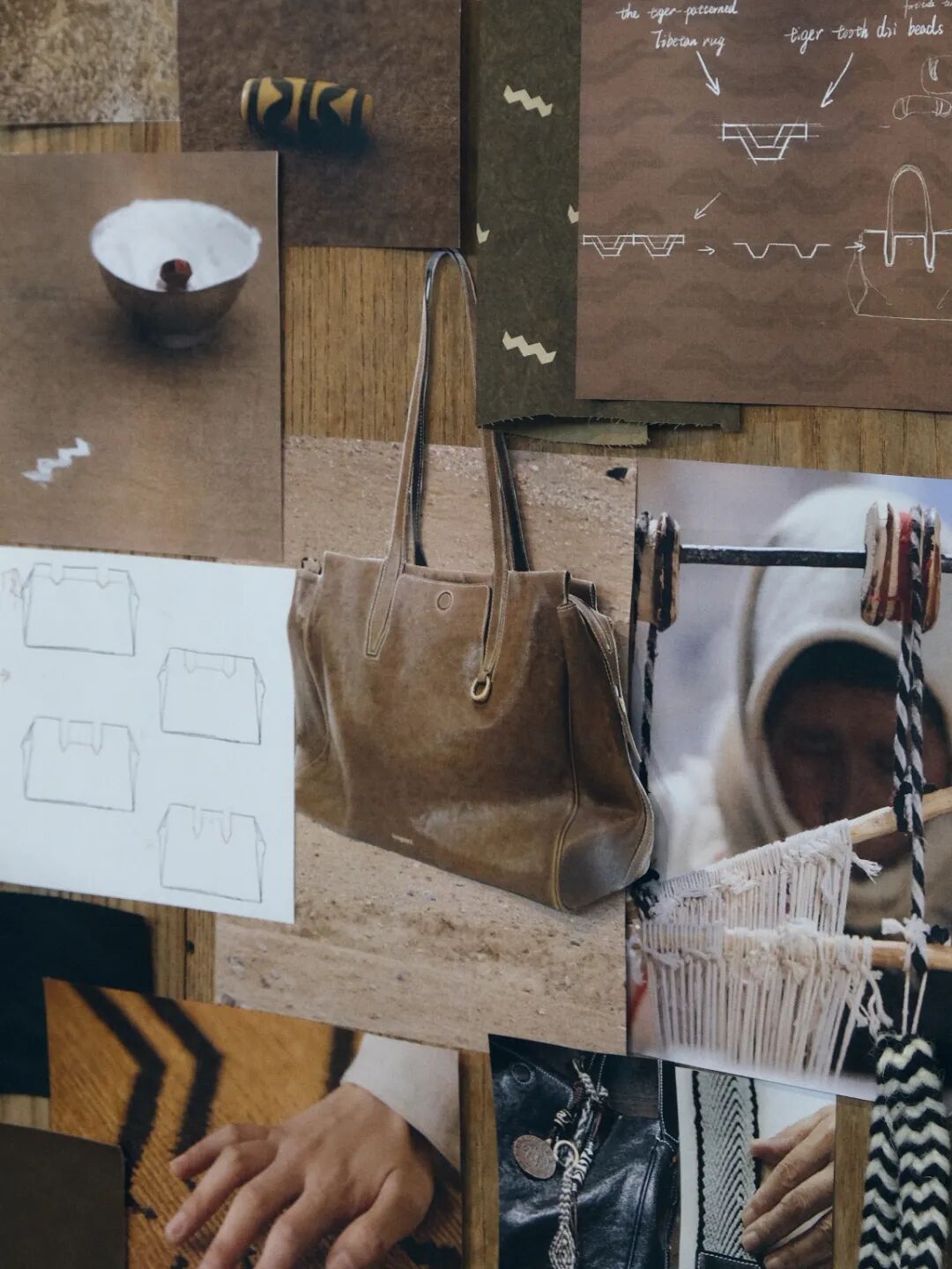 眼光不止落在故乡,“循迹”系列将藏区虎牙纹图腾融入极简包袋设计,将非遗工艺乌朵编织制成包袋挂件。而这一元素不只是装饰,更是一个口袋的开口。而在最俏皮的“松月”系列中,月相的美学意象被转化为一只以四种方式背携的包,在实用中诠释日常生活之美。
