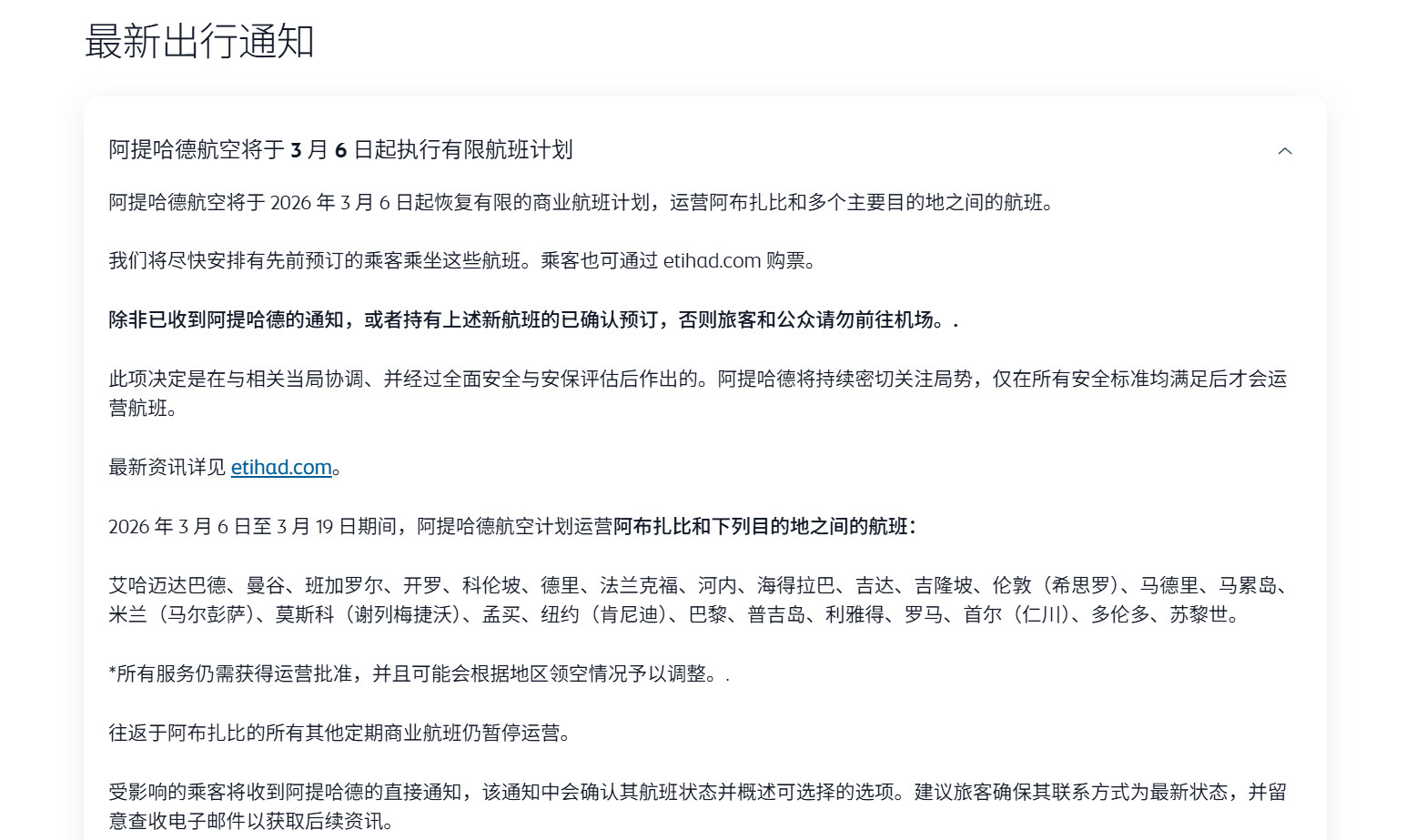 阿提哈德航空宣布将于2026年3月6日起恢复有限的商业航班,运营阿布扎比和多个主要目的地之间的航班。所有服务仍需获得运营批准,并且可能会根据地区领空情况予以调整。.往返于阿布扎比的所有其他定期商业航班仍暂停运营。