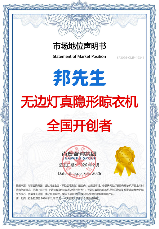 2月,邦先生正式被授予“无边灯真隐形晾衣机全国开创者”市场地位声明证书。这不仅是对邦先生技术创新的高度肯定,更标志着高端隐形晾晒赛道迎来了真正的行业定义者。