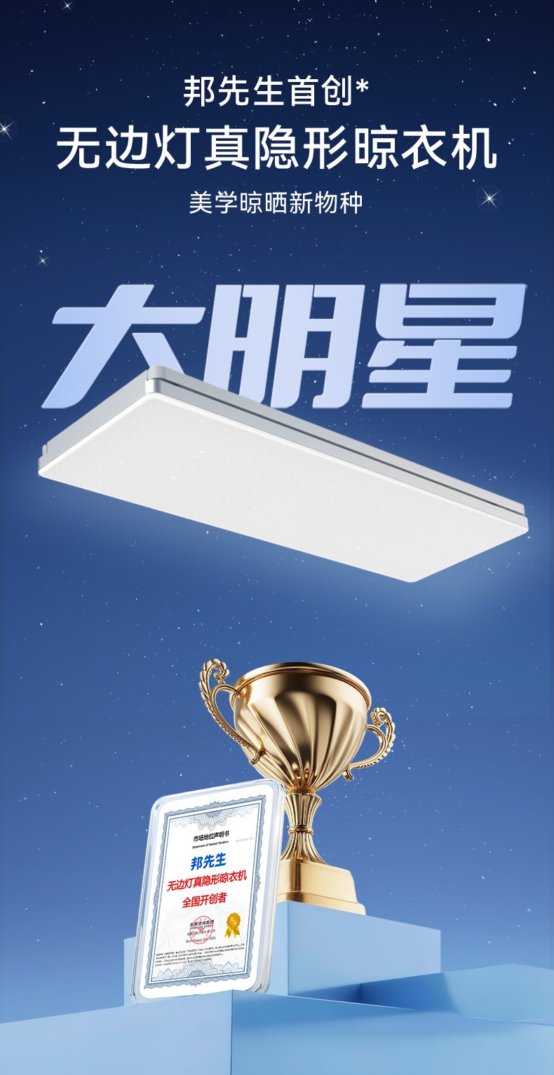 更重要的是体系化能力的支撑。“无边灯真隐形” 并非单点技术炫技,而是融合结构力学、工业设计、光学应用、智能控制等多领域的系统工程。邦先生凭借多项原创专利构筑的技术壁垒,以及严苛的供应链管理与品控体系,最终将这一复杂构想稳定落地为量产商品。此番以 “开创者” 之名推出大明星,既是技术实力的集中释放,也意在抢占新一代晾晒产品演进路径的定义权与主导权。