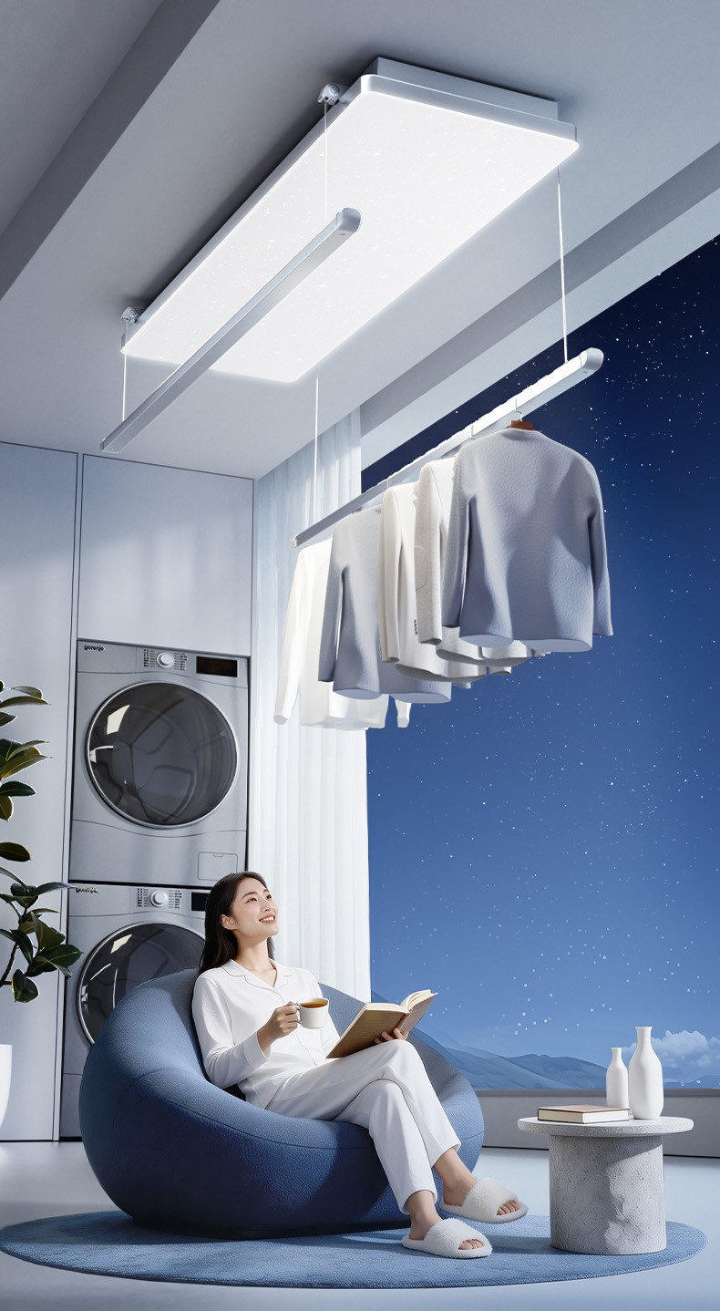 更具巧思的“灵动四翼”设计,使晾杆可90°翻转收纳,在非使用状态下机身线条被极致简化,传统晾衣机笨重的“空中堡垒”形象被彻底解构。