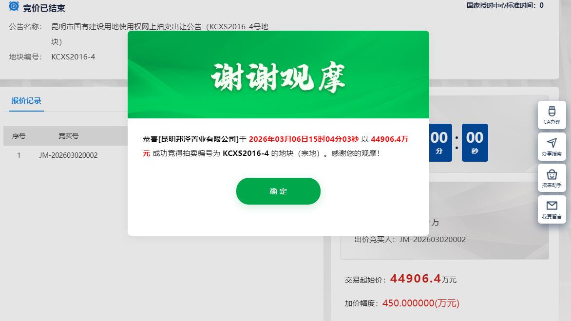 该宗地为KCXS2016-4号地块,位于日新东路和前兴路交汇处,最终被邦泰旗下子公司昆明邦泽置业有限公司以底价约4.5亿元摘得,成交楼面价约6542元/㎡,单价为 1134 万元/亩。