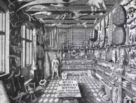 文艺复兴时期,典型的“好奇心橱柜”,是由一个在四壁摆满了特制橱柜围合起来的空间构成。除了必要的窗户和门以外,包括天花板在内的空间,都用于陈列和悬挂来自不同时间和空间背景的收藏品。其中既有古代艺术品、人工制品,也有动植物标本、矿石、贝壳,还有来自各大洲的反映民俗民风的珍稀物品。