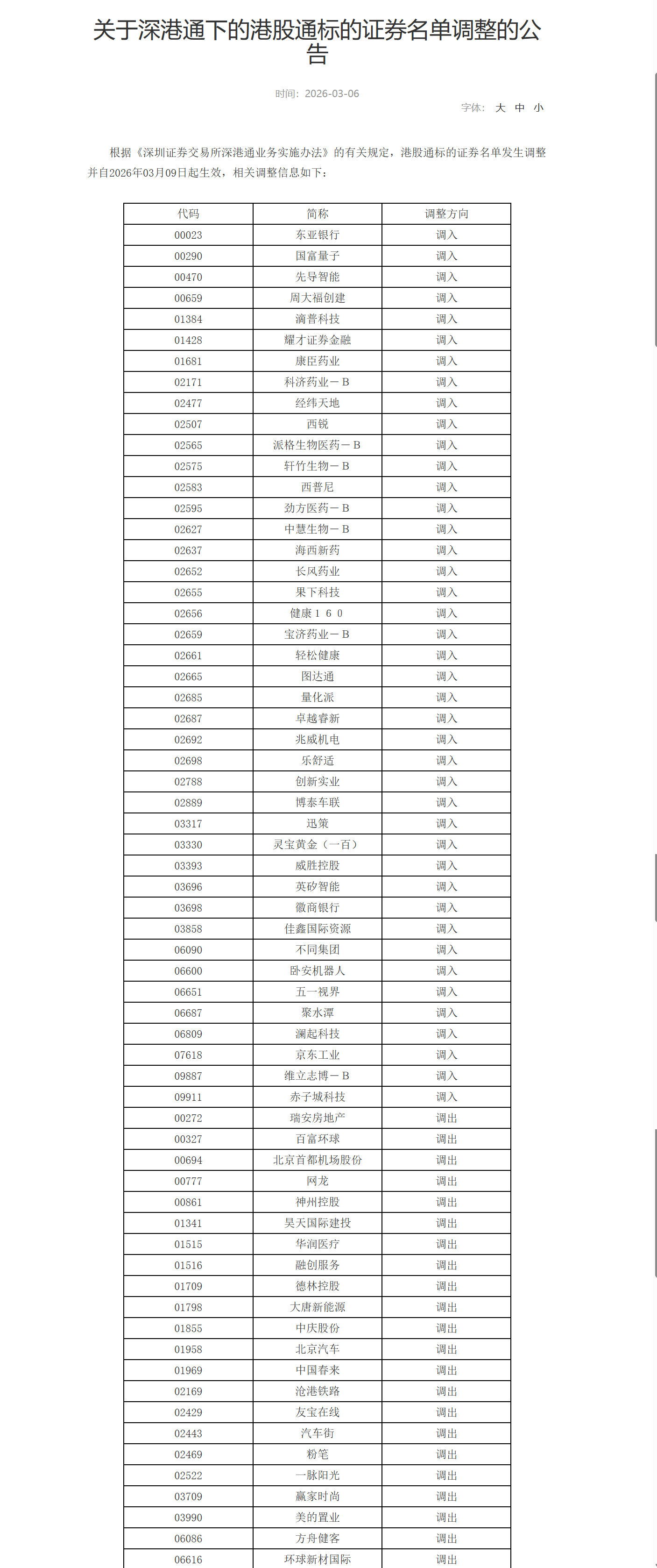 根据《深圳证券交易所深港通业务实施办法》的有关规定,港股通标的证券名单发生调整并自2026年03月09日起生效。其中,调入先导智能、滴普科技、耀才证券金融、京东工业等,调出北京首都机场股份、神州控股、北京汽车、美的置业等。