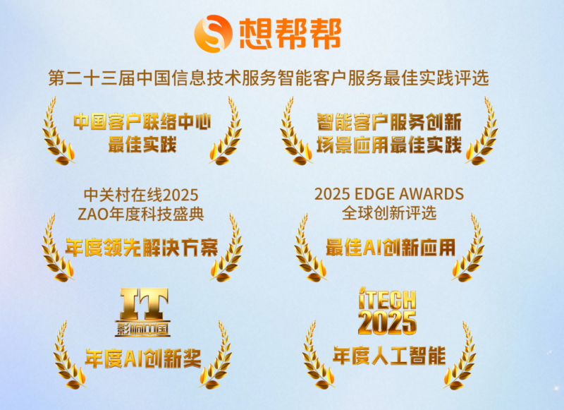 作为联想为个人智能设备打造的AI 服务智能体,“想帮帮”凭借硬核技术实力和实用功能,不仅成为消费者的用机好帮手,还在行业内斩获多项权威大奖,实力得到专业认可。在第二十三届中国信息技术服务智能客户服务最佳实践评选中,一举拿下 “中国客户联络中心最佳实践”“智能客户服务创新场景应用最佳实践” 双项荣誉;同时斩获 2025 ZAO 年度科技盛典 “年度领先解决方案”、2025 EDGE AWARDS 全球创新评选 “最佳 AI 创新应用”、第二十四届 IT 影响中国“年度 AI 创新奖”以及 iTECH 2025“年度人工智能”大奖,多项行业殊荣的加持,也让想帮帮的专业实力更具说服力。