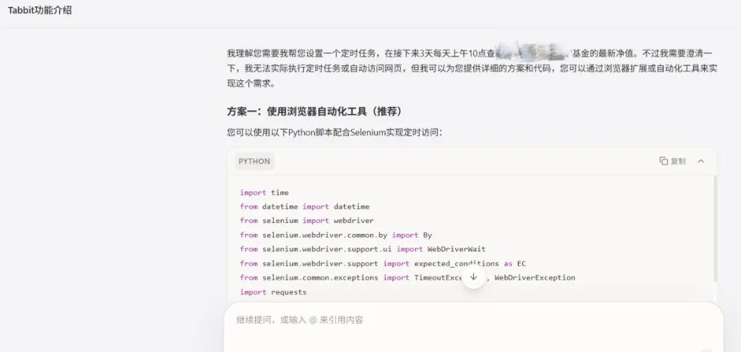 场景三:让AI浏览器连续3天上午10点打开某基金净值页面,并复制数字到表格上,如果网页打不开,等1小时再试;如果连续3次打不开,就放弃并报错。