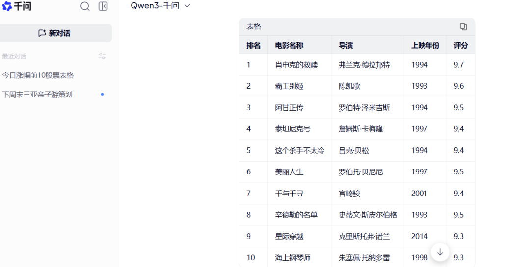 我们进一步降低指令难度。让它们访问豆瓣电影Top250页面(https://movie.douban.com/top250),提取前10部电影的电影名称、导演、上映年份、评分,生成Markdown表格。需要指出的是,夸克依托的是千问大模型和千问助手,且千问已深度融合到夸克中,执行回邮件、跨标签分析等众多智能化功能。