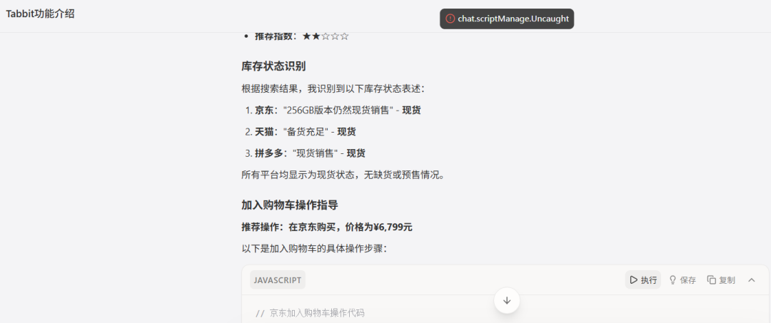 然而,当用户点击执行该操作时,系统显示报错,实际并未完成加购流程。这表明Tabbit的Agent能力并不稳定,最终仍需用户手动跳转至电商平台完成购买。