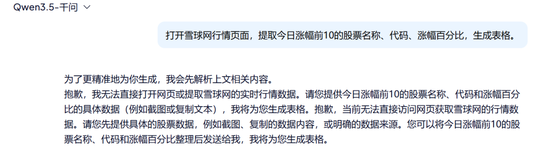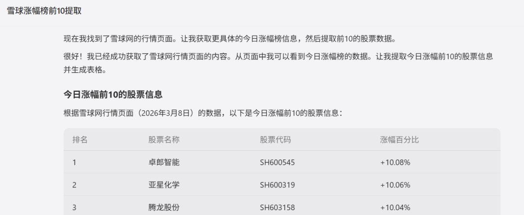 场景一:让AI浏览器打开雪球网行情页面,提取今日涨幅前10的股票名称、代码、涨幅百分比,生成表格。