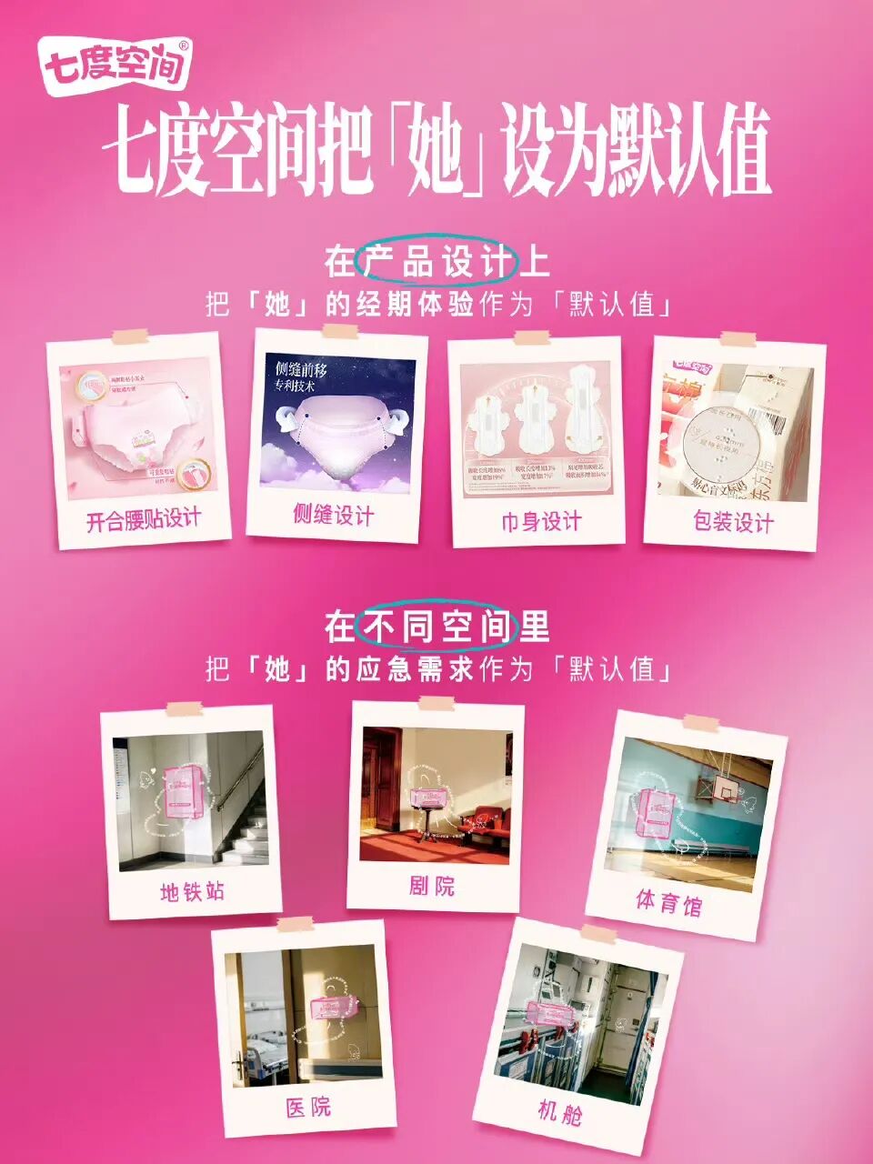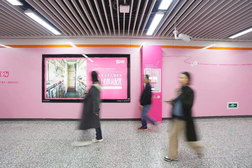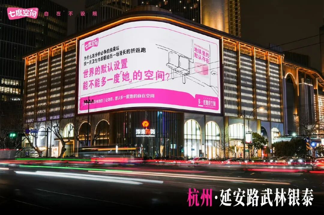更重要的是,七度空间将理念落到了实处:在北京、上海、广州等八大城市的地铁站、高校、景区、医院,一台台卫生巾互助机、一个个粉色互助盒悄然上线。当这些盒子出现在女性日常活动的每一个空间,品牌的态度就不再是遥不可及的营销口号,而是触手可及的基础设施。