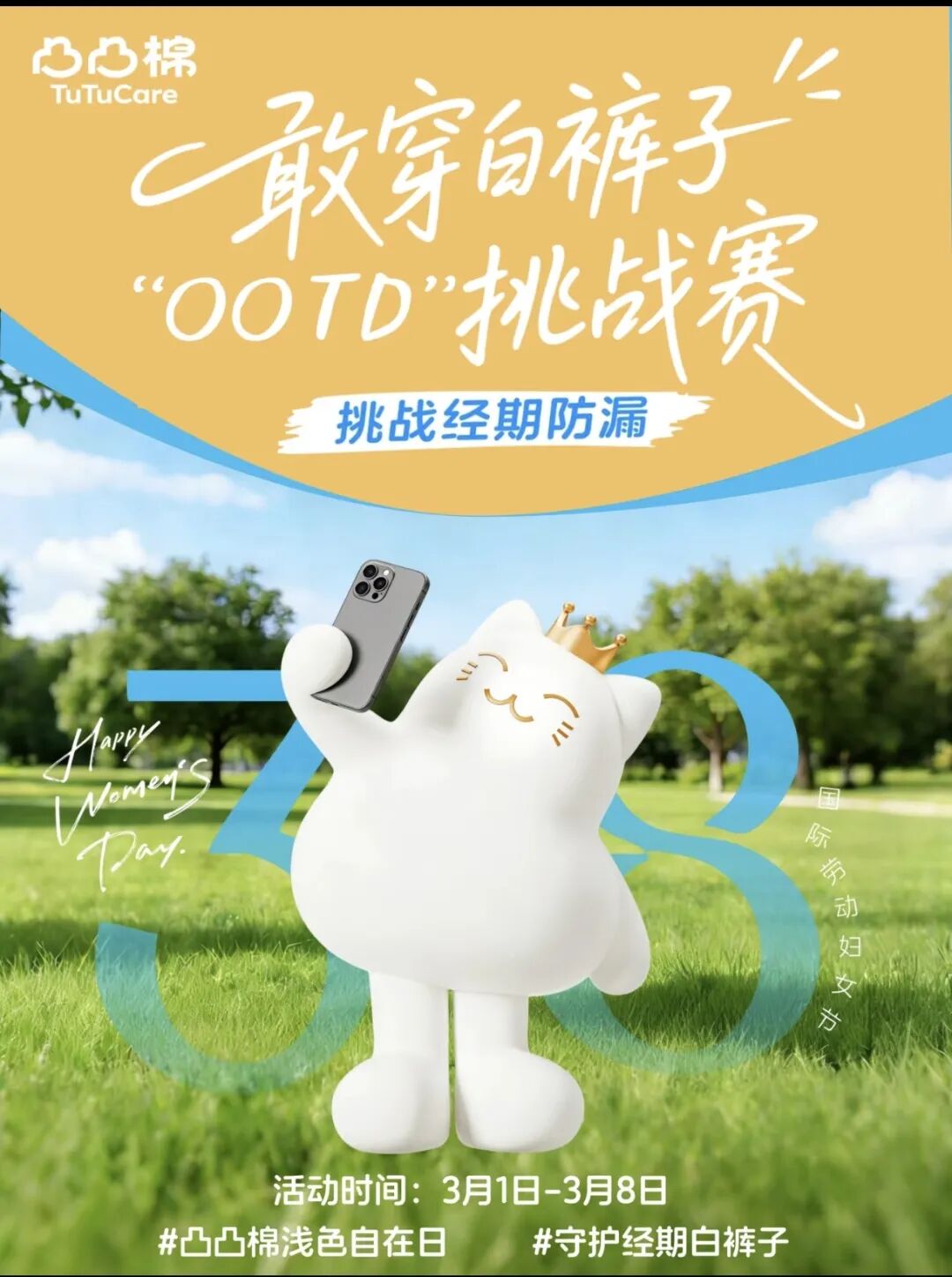 同样,凸凸棉发起的 「守护经期白裤子」 挑战,则是一场针对“经期羞耻”的物理性突围。