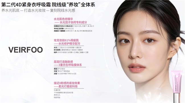 作为扎根韩国整形外科的专业品牌,VEIRFOO 薇尔肤始终以临床整形技术为研发根基,深耕面部填充与胶原灌注抗老领域,秉持“自然和谐的美” 的核心主张。此次新品< 第二代 4D紧身衣呼吸霜>突破性地将医美级养肤逻辑融入底妆研发,打造集“水光、修护、遮瑕、持妆、定妆”于一体的全能配方,一瓶即可替代“水光针+打底精华+妆前乳+粉底+定妆”的多重步骤,精准契合当代消费者“精简护肤、功效叠加”的核心需求。