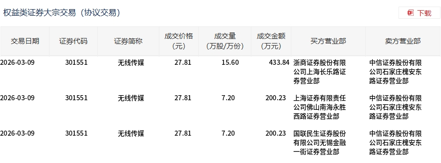 3月9日,无线传媒大宗交易成交30万股,成交额834.3万元,占当日总成交额的6.04%,成交价27.81元,较市场收盘价32.38元折价14.11%。