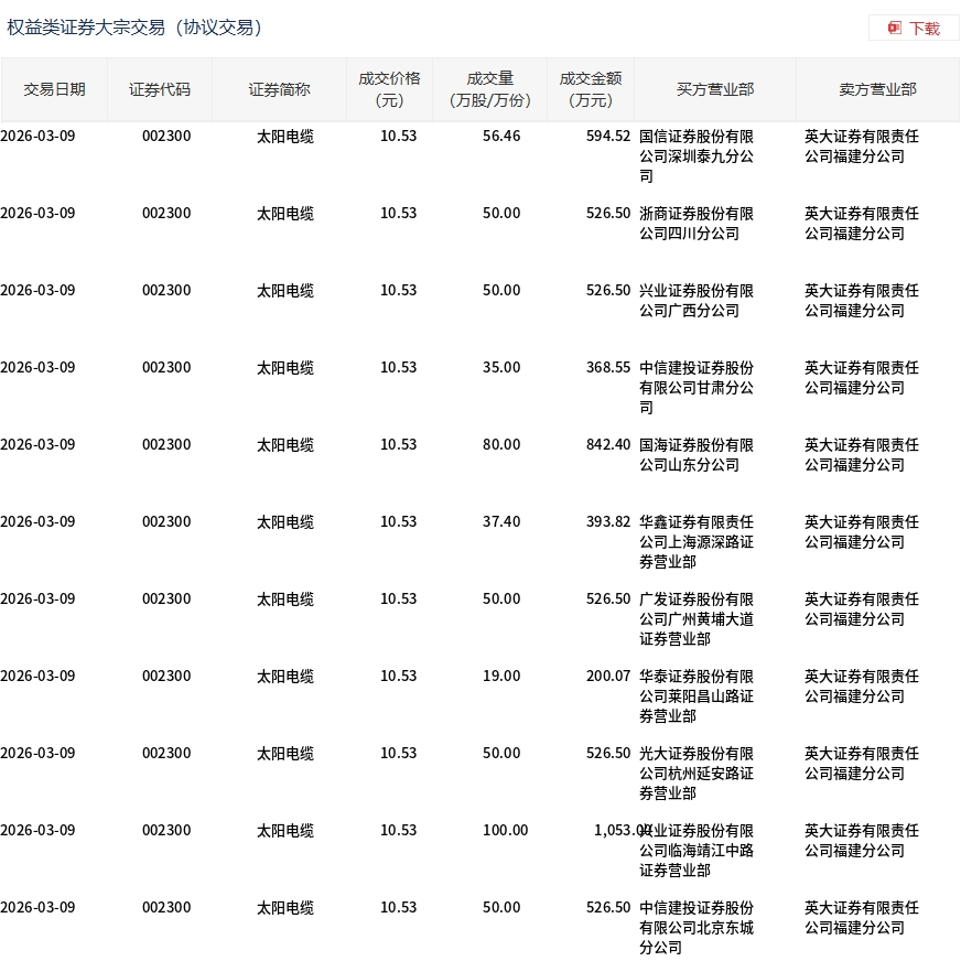 3月9日,太阳电缆大宗交易成交577.86万股,成交额6084.86万元,占当日总成交额的7.33%,成交价10.53元,较市场收盘价11.57元折价8.99%。