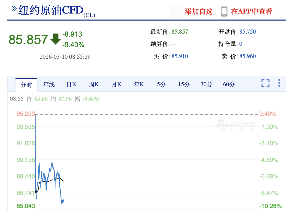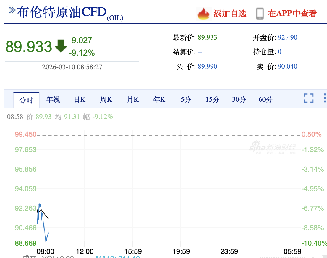 继昨日暴涨逼近120美元/桶后,国际油价迅速回落。3月10日,亚太市场交易时段,布伦特原油和纽约原油双双跌超9%,截至界面新闻发稿前,分别报每桶89.93美元和85.86美元。