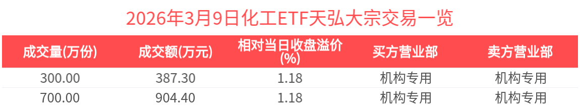 2026年3月9日,化工ETF天弘(159133.SZ)收跌1.39%,发生2笔溢价大宗交易,成交价均为1.29元,较当日收盘价溢价1.18%。成交额分别为387.30万元,904.40万元,总成交额为1291.70万元,居可比基金首位。(数据来源:Wind)